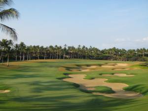 The finish is all finesse as you head back toward the clubhouse. A couple of technical par fours before you reach the signature seventeenth, the only hole that is truly exposed to the Pacific. Here you have to parasail one through the sea breeze onto a well protected green-anything left hits lava and heads toward Japan. The finish is a beautiful short par four over ancient Hawaiian fish ponds and a Nicklausian sea of sand into a demanding tight green set.