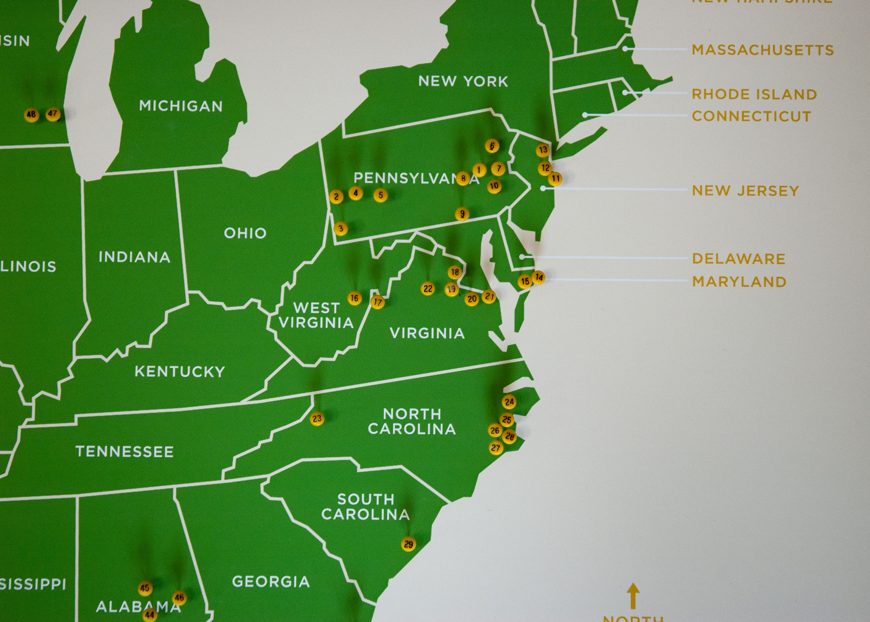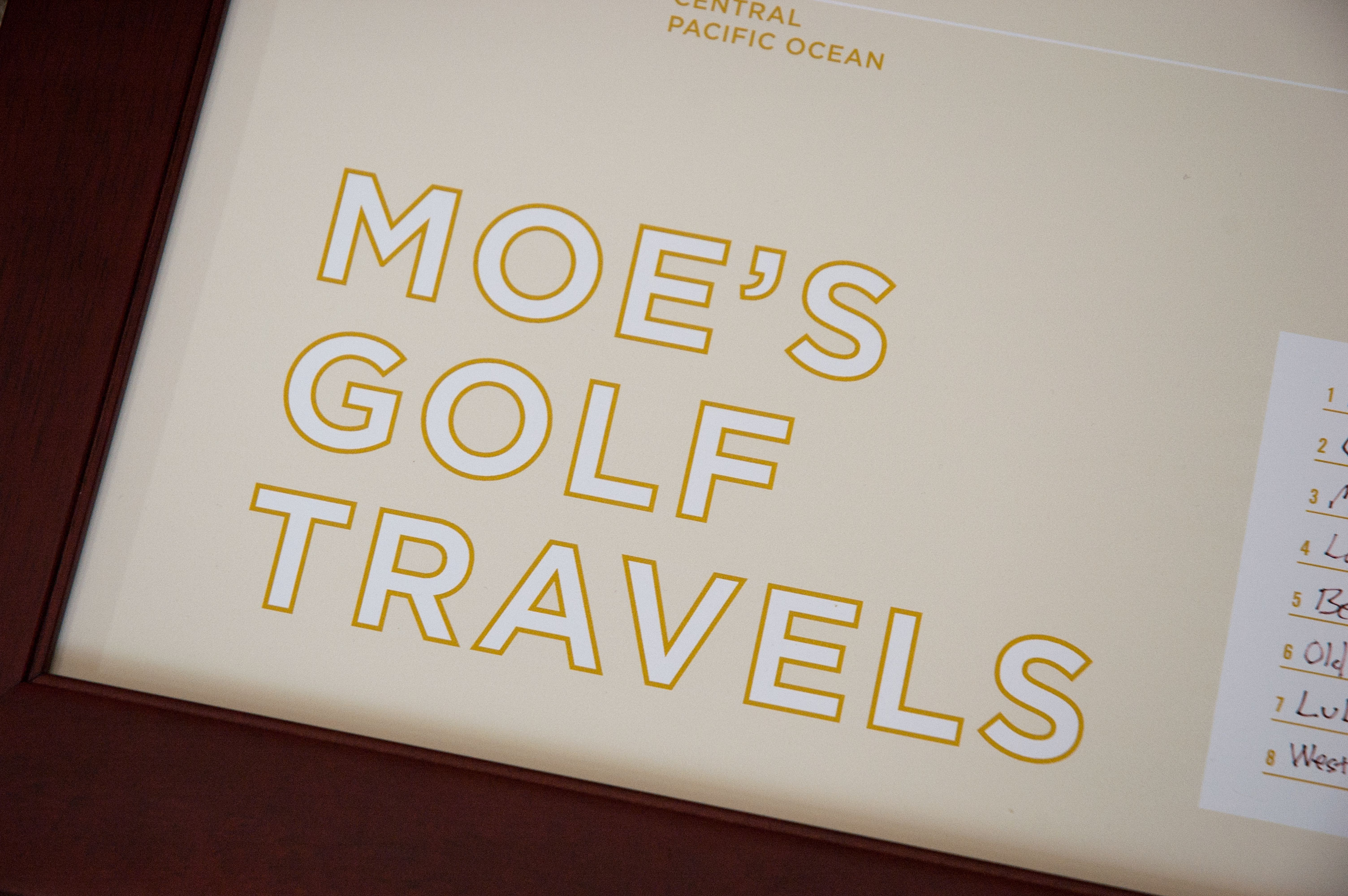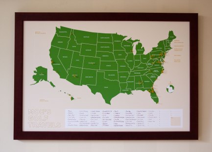 The map and background are customized to colors your choice. Name it what you like (say “Steve’s Golf Adventures”) and it can be mounted on foam core and be tastefully framed.