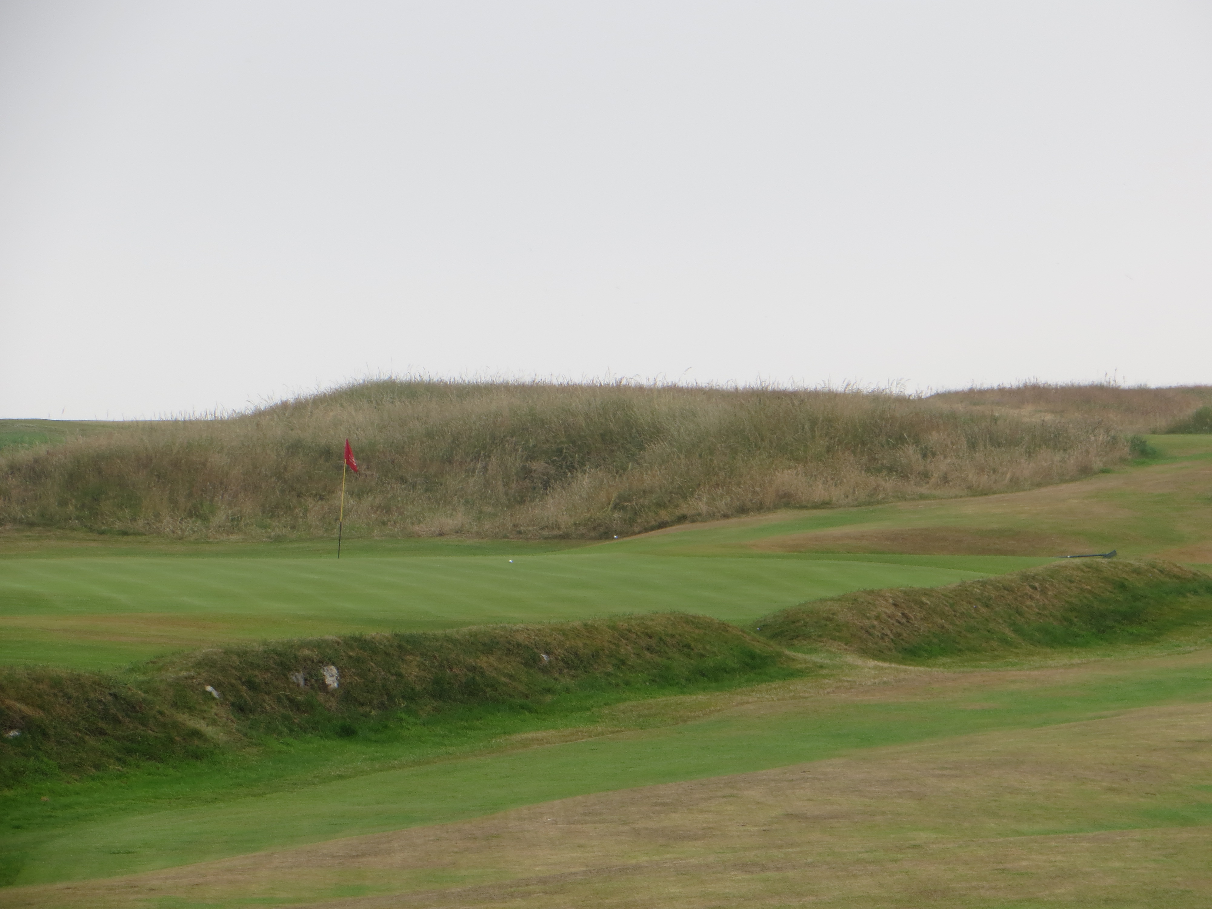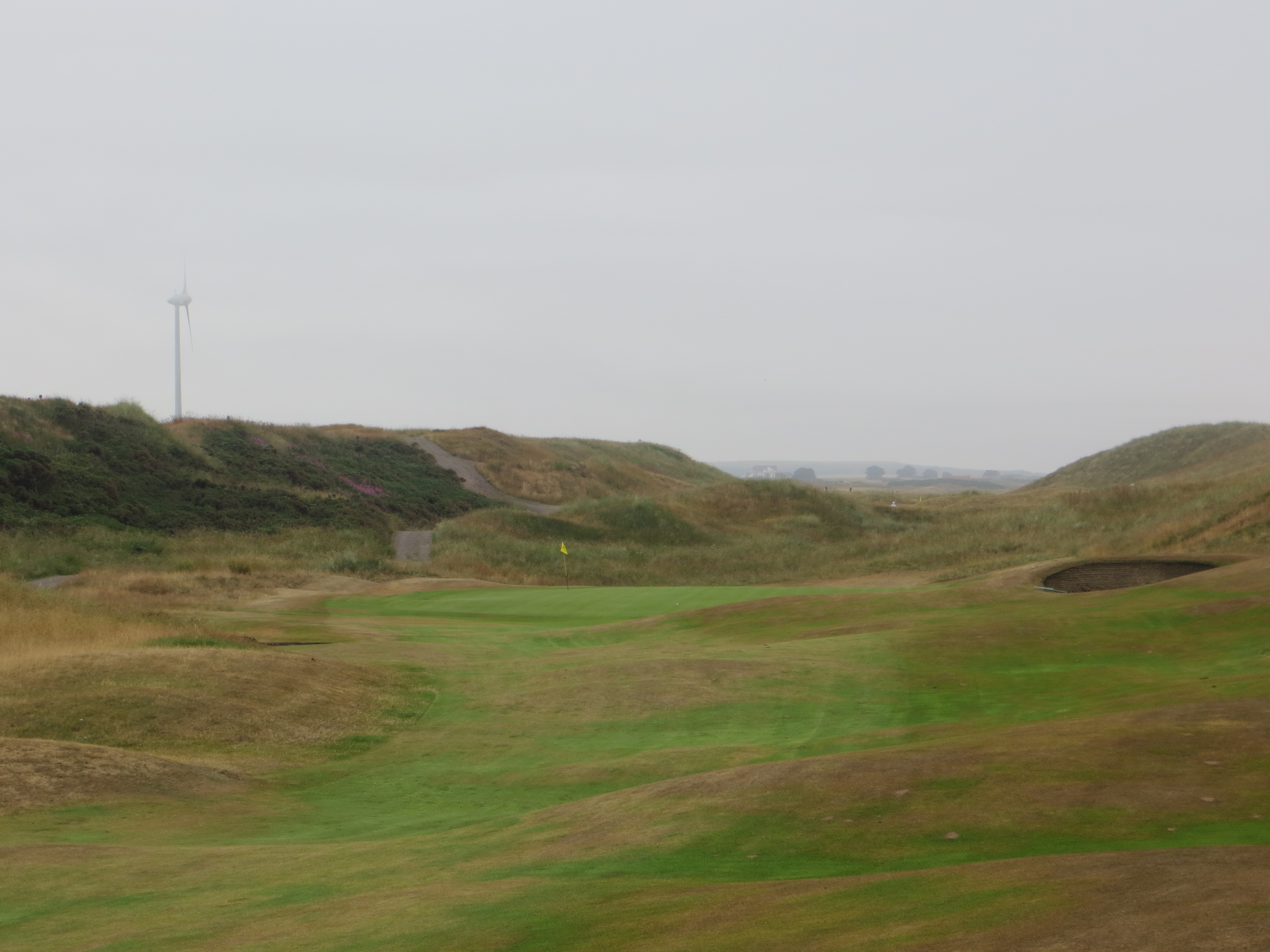 Aberdeen 8 GreenThe eighth has a 43-yard steeply ramped green encircled by ten voracious pits with serious magnetic attraction .  One club elevation adjustment for the downhill is mitigated by the gusts of wind coming over the top of those imposing dunes behind that separate you from the beach.