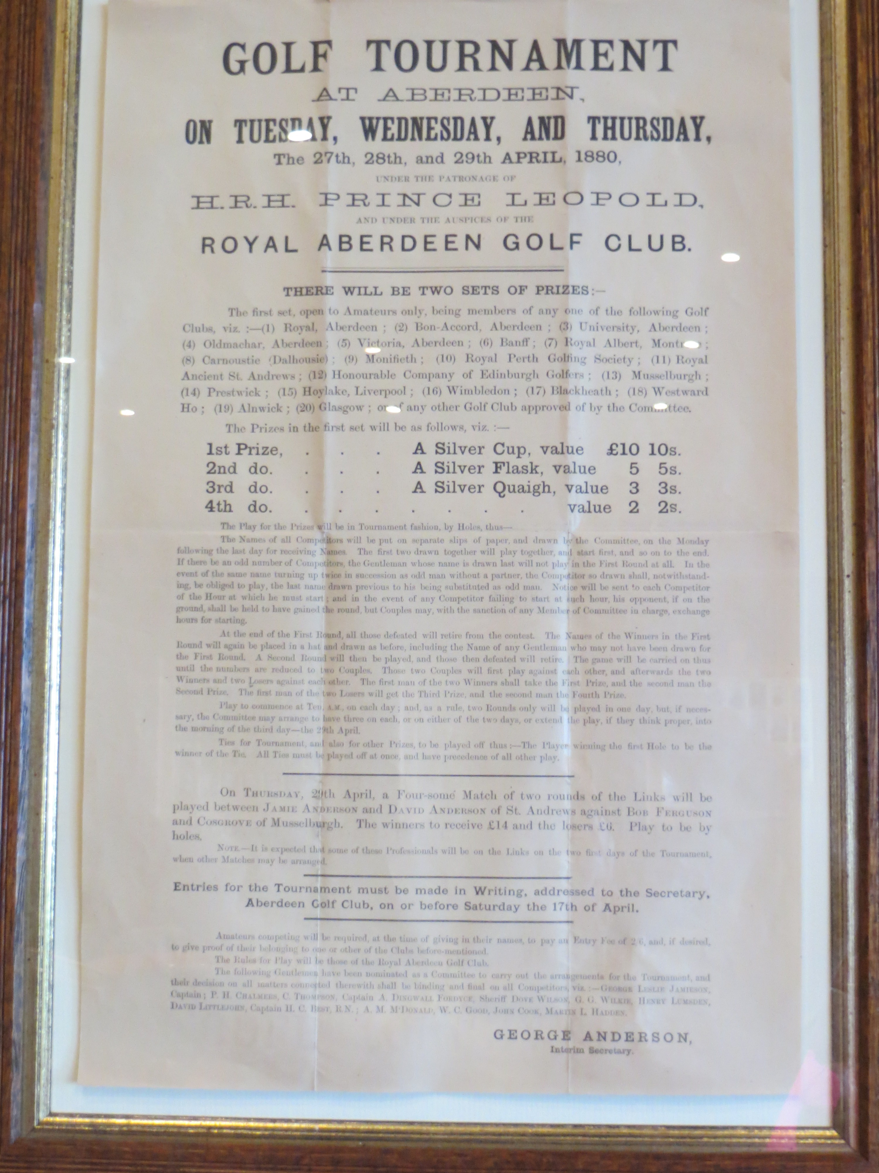 ABERDEEN Competition AnnouncementThis announcement is for an interclub competition in April of 1880 with members of Royal St. Andrews, Carnoustie, Hoylake, Prestwick, Westward Ho, among others.  The prizes for the winners were silver Cups, Flasks, and Quaighs.  No self respecting champion would be caught dead without a silver Quaigh, whatever that is, in his trophy case.