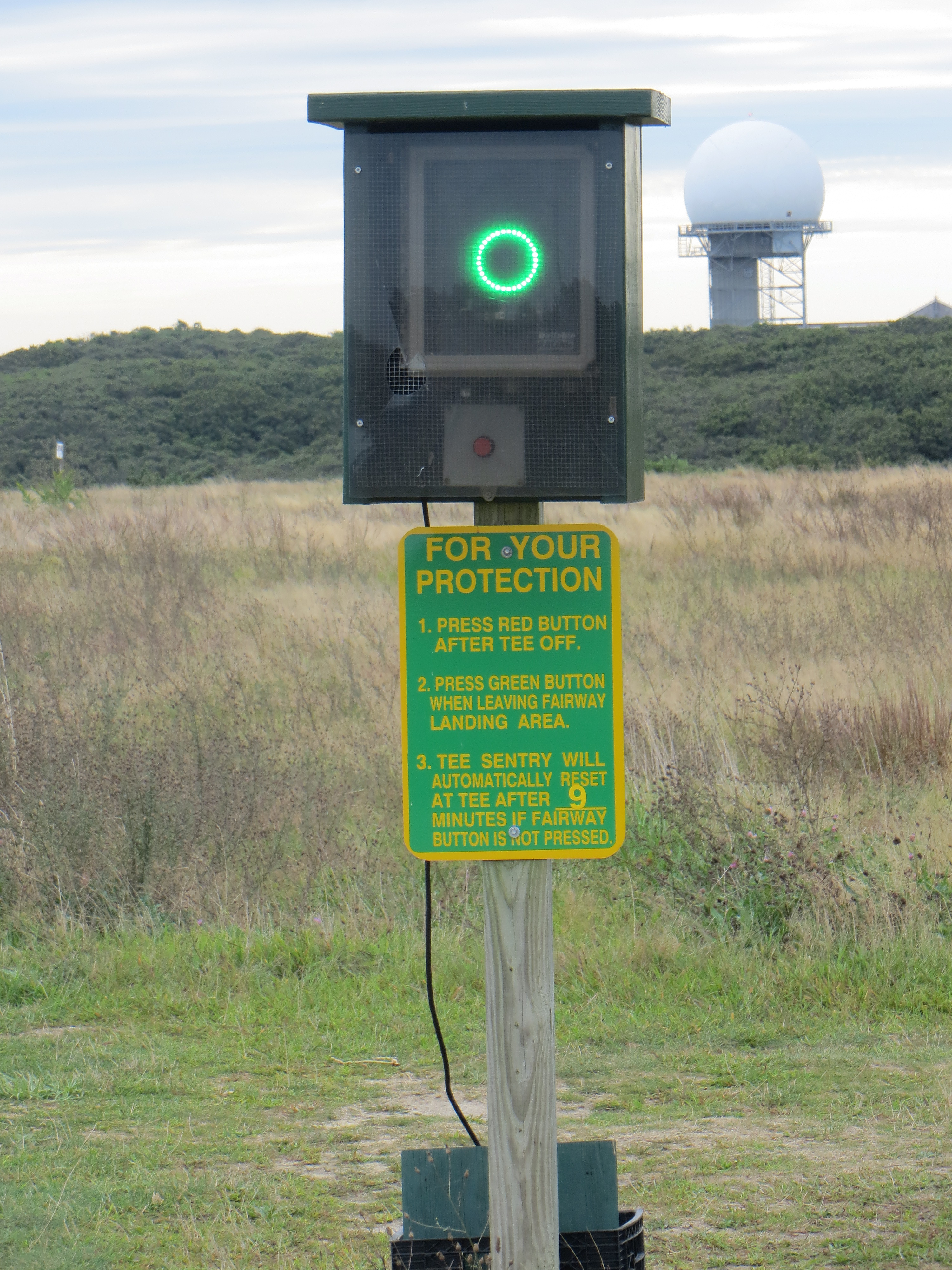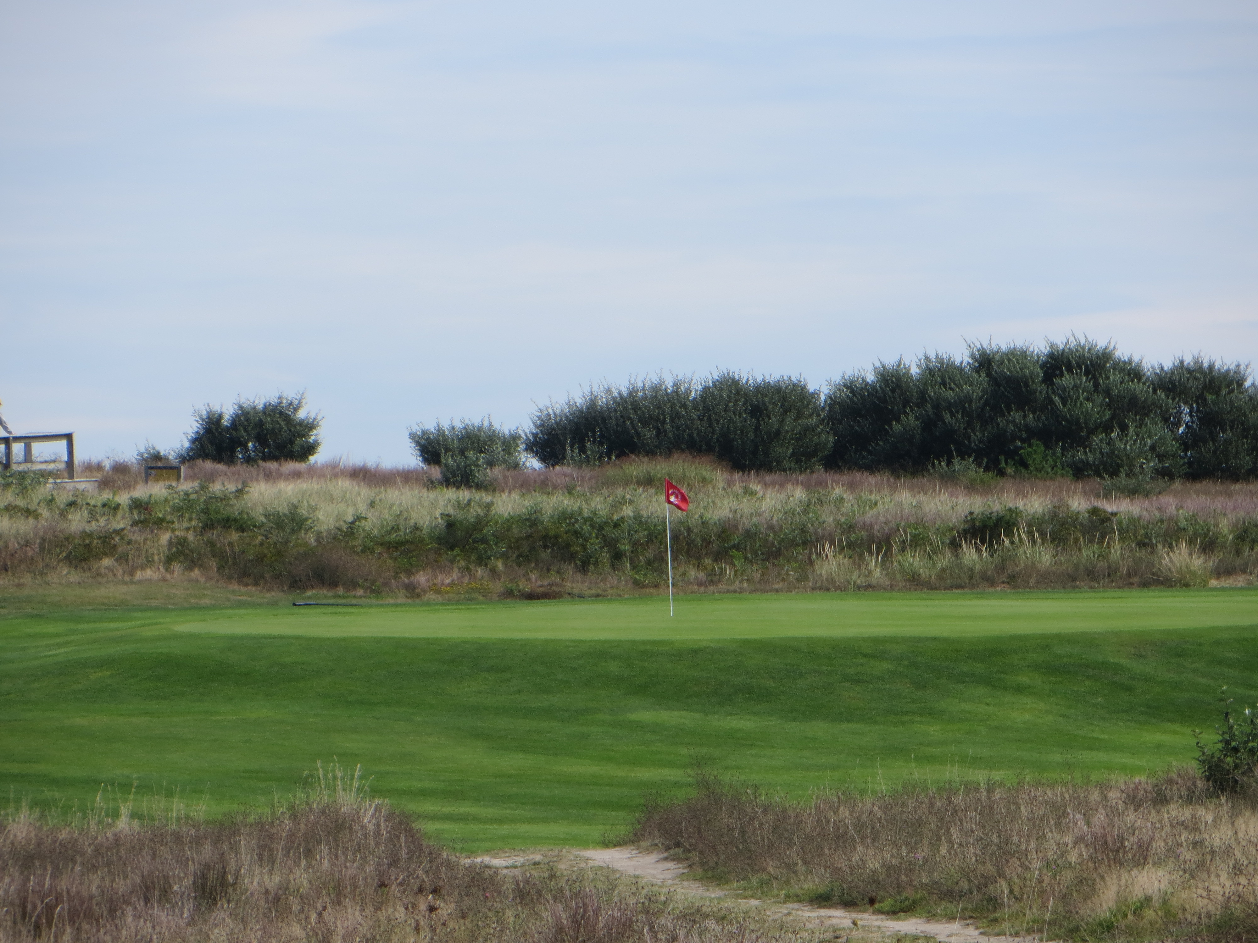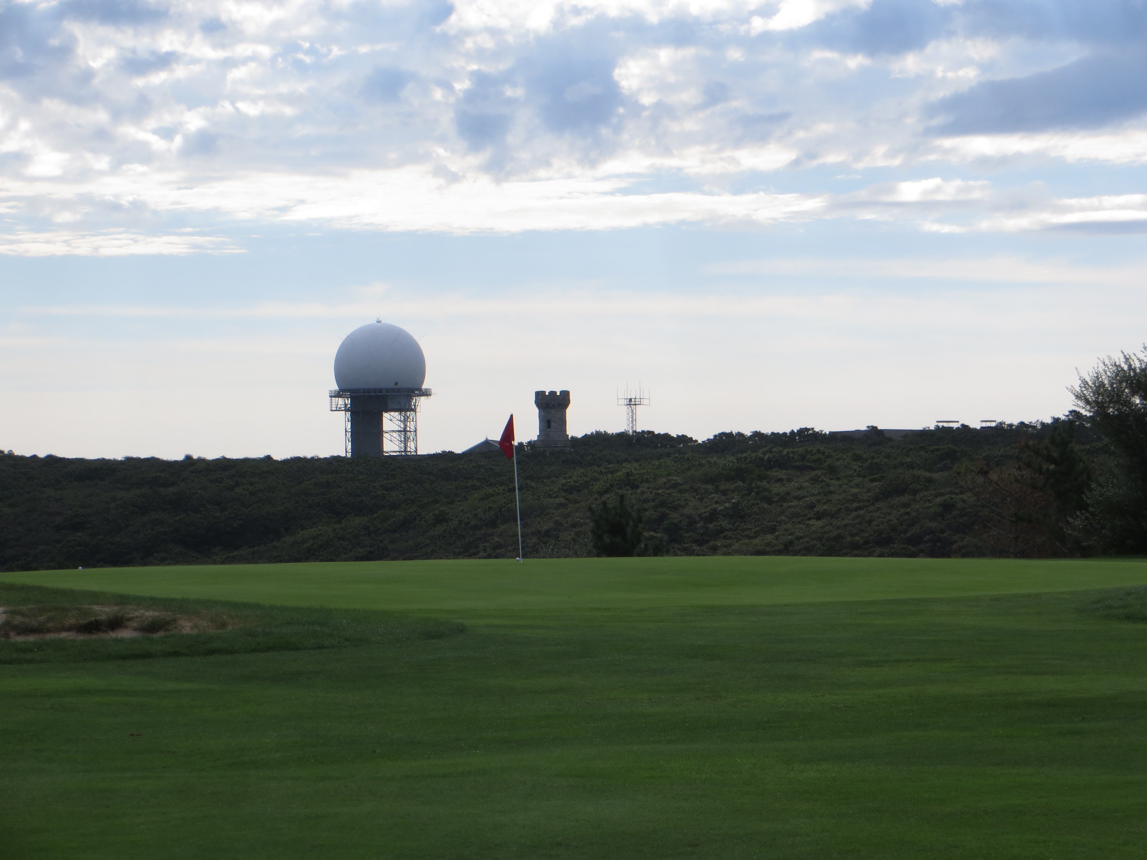 The hilltop green setting on the fifth framed by dune and porpoise play lands.