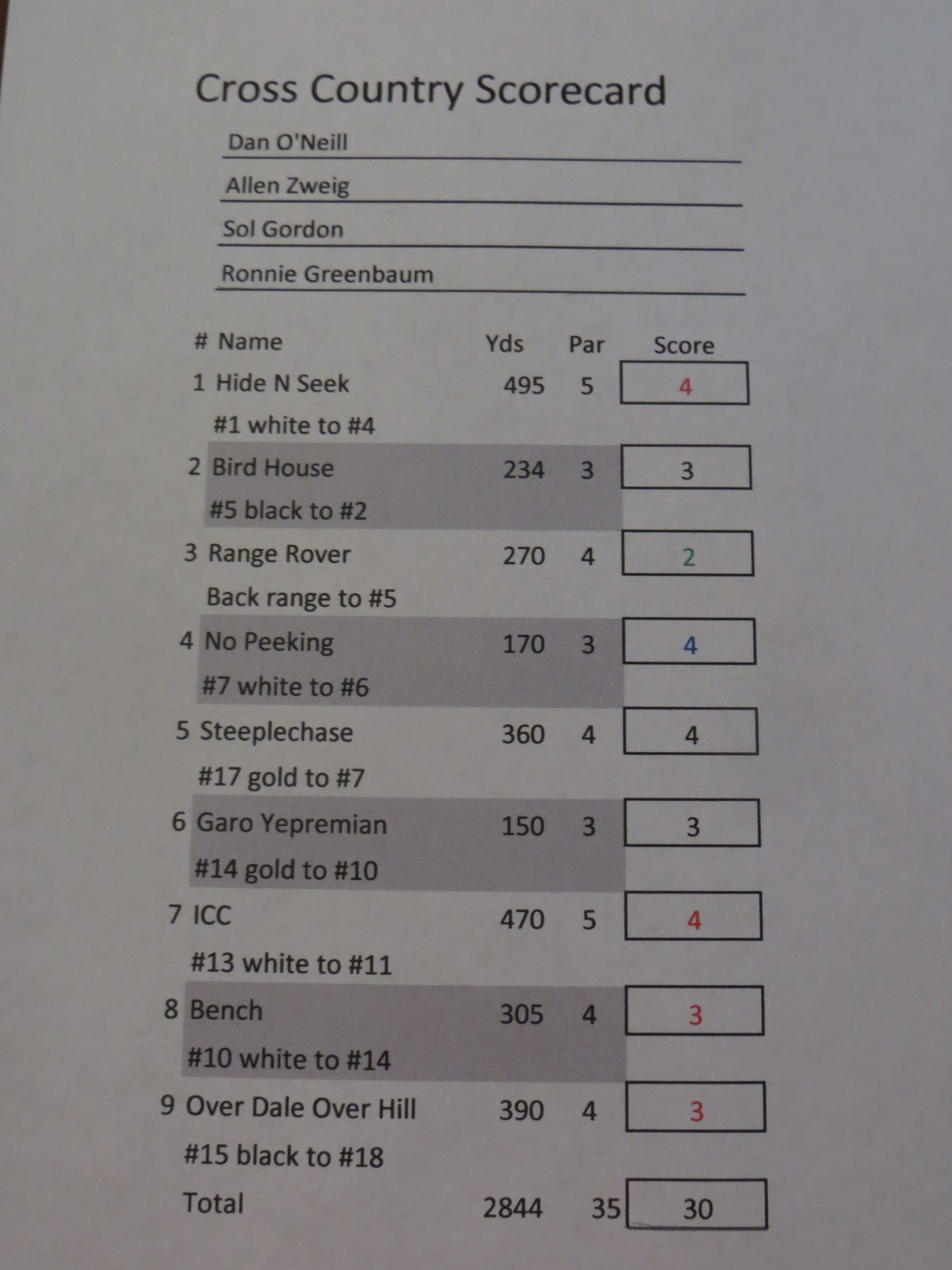 Indian Summer, or fall as we call it in the east, offers a unique opportunity for our season ending annual Cross Country event. Through the quasi-capable efforts of Ben and Bill of Dwinkoff Associates nine new and original holes were plied from the landscape of one of our two courses. Using alternative tees and approach lines to existing greens they presented a test that required creative tactics, patience, and a smidge of luck.