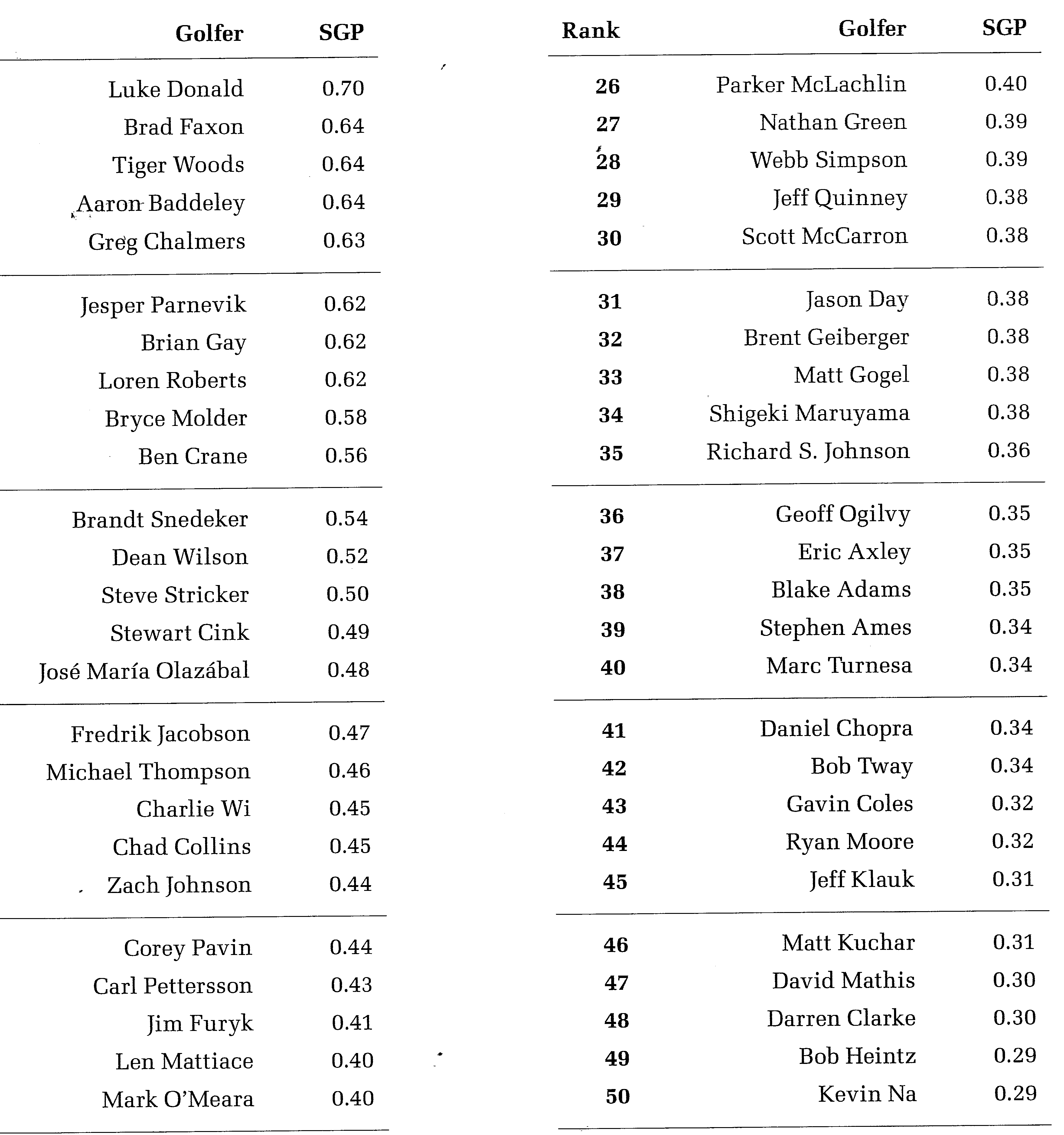 Below is a Broadie chart that shows the top 50 putters on the PGA Tour from 2004 to 2012 using Strokes Gained Putting (SGP) as the measure of relative performance. Not surprising Luke and Tiger are in the top five but so are Aaron Baddeley and Greg Chalmers. Some surprise in the names not in the top 20.