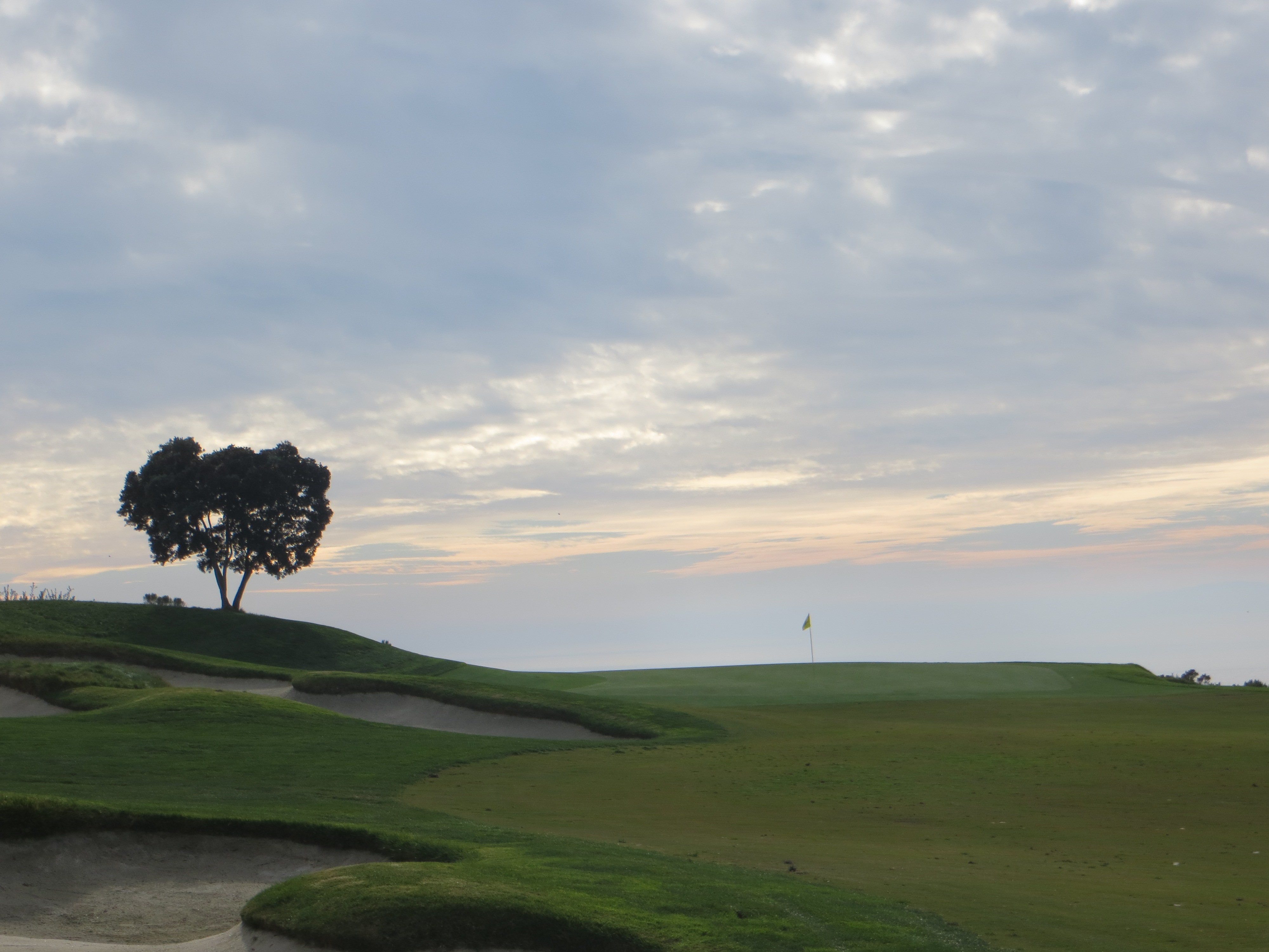 After meandering inland for a couple of holes, the postcard hole of the day is the only par five on the inward half at seventeen. A pond in the elbow of the dogleg right wards you left off the tee and the hole then ambles uphill to a green perched on a ledge above the ocean. Positioning the second to the left gives the best angle for a short iron into a very narrow green with nastiness all around. There is a single spread tree standing high above the green which gives this hole a very coastal California flavor.
