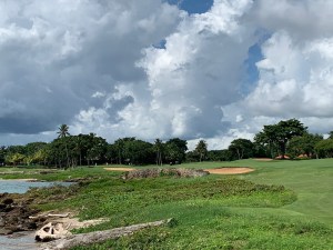 Next is a signature par three that sits adjacent to the backyard of Pete’s Dominican residence.  This green is a much more generous target then the fifth but the sweeping contour of the putting surface can lead to serious head scratching as your ball separates from the hole and you think you can make out an audible chortle from just over the fence to your right.