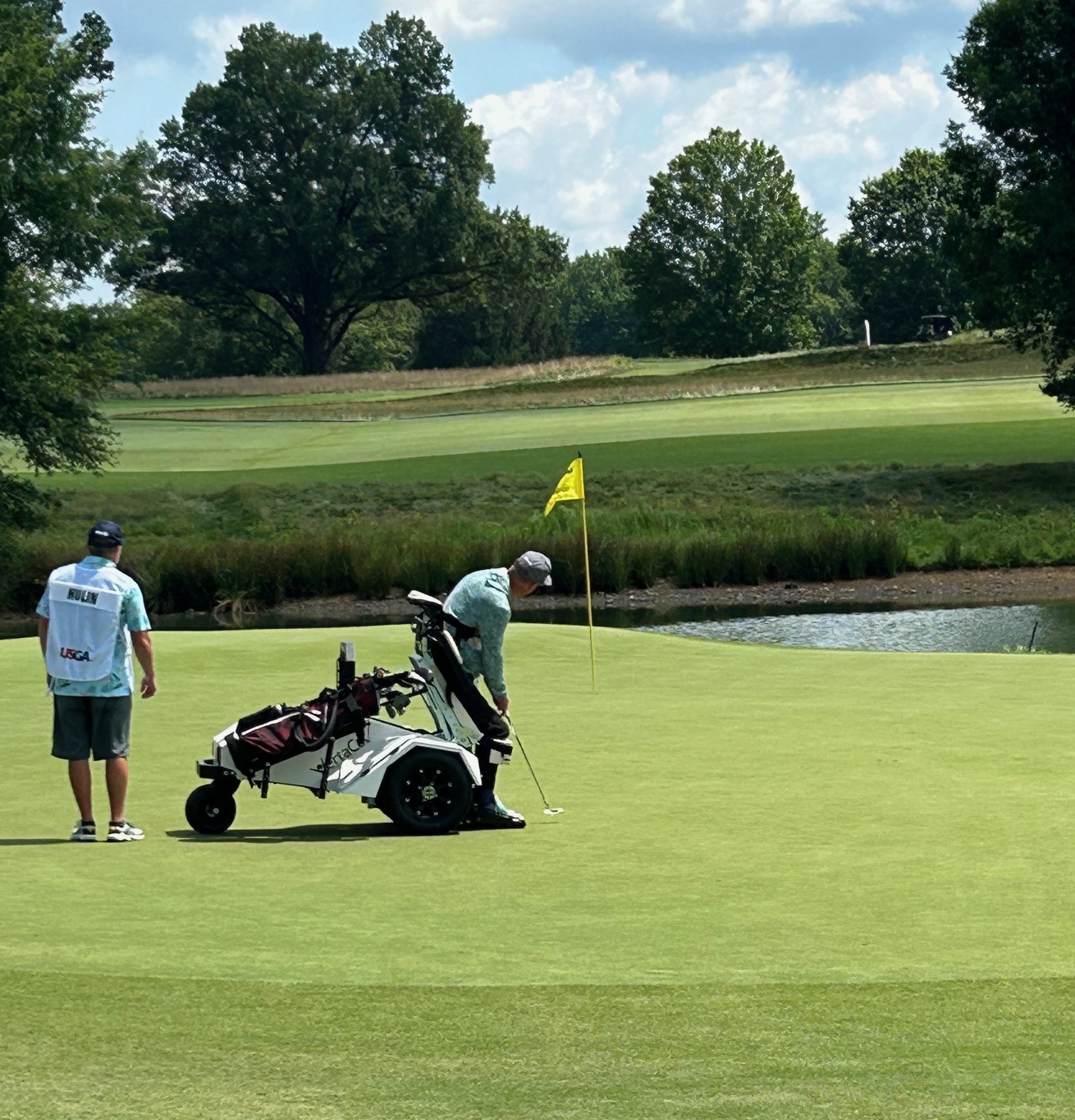 Seated competitor putting from his VertaCat cart on the sprawling 5th green