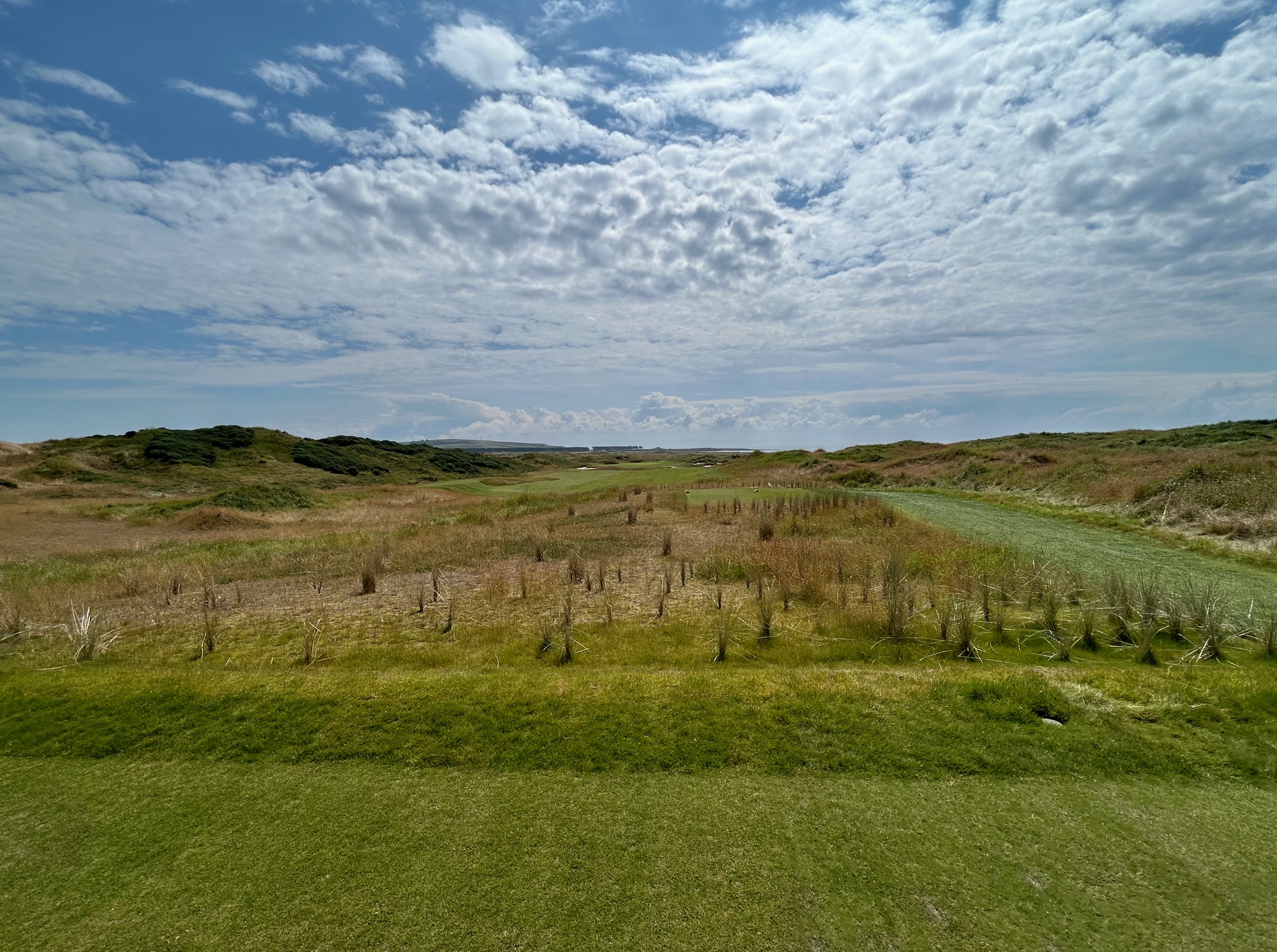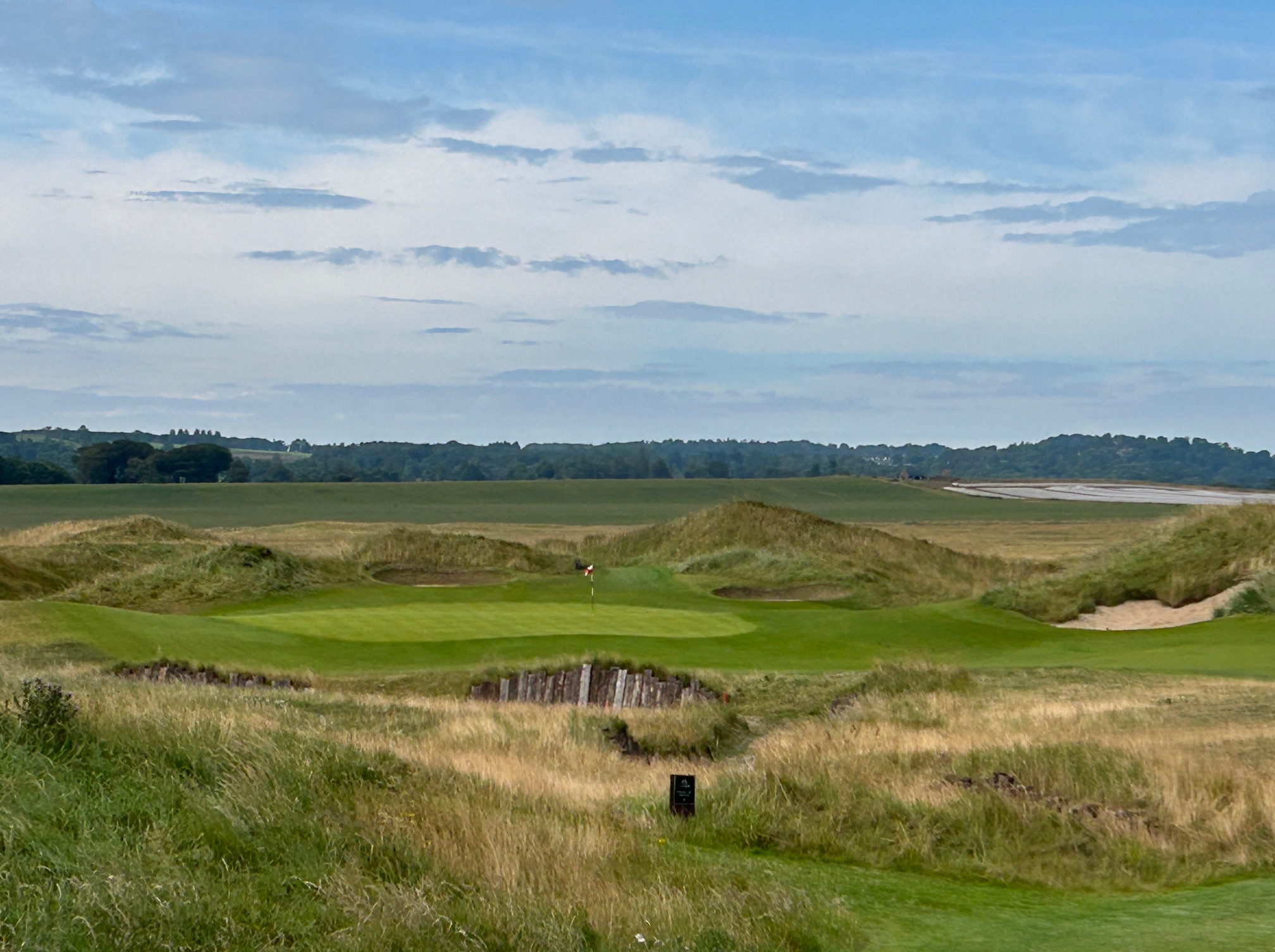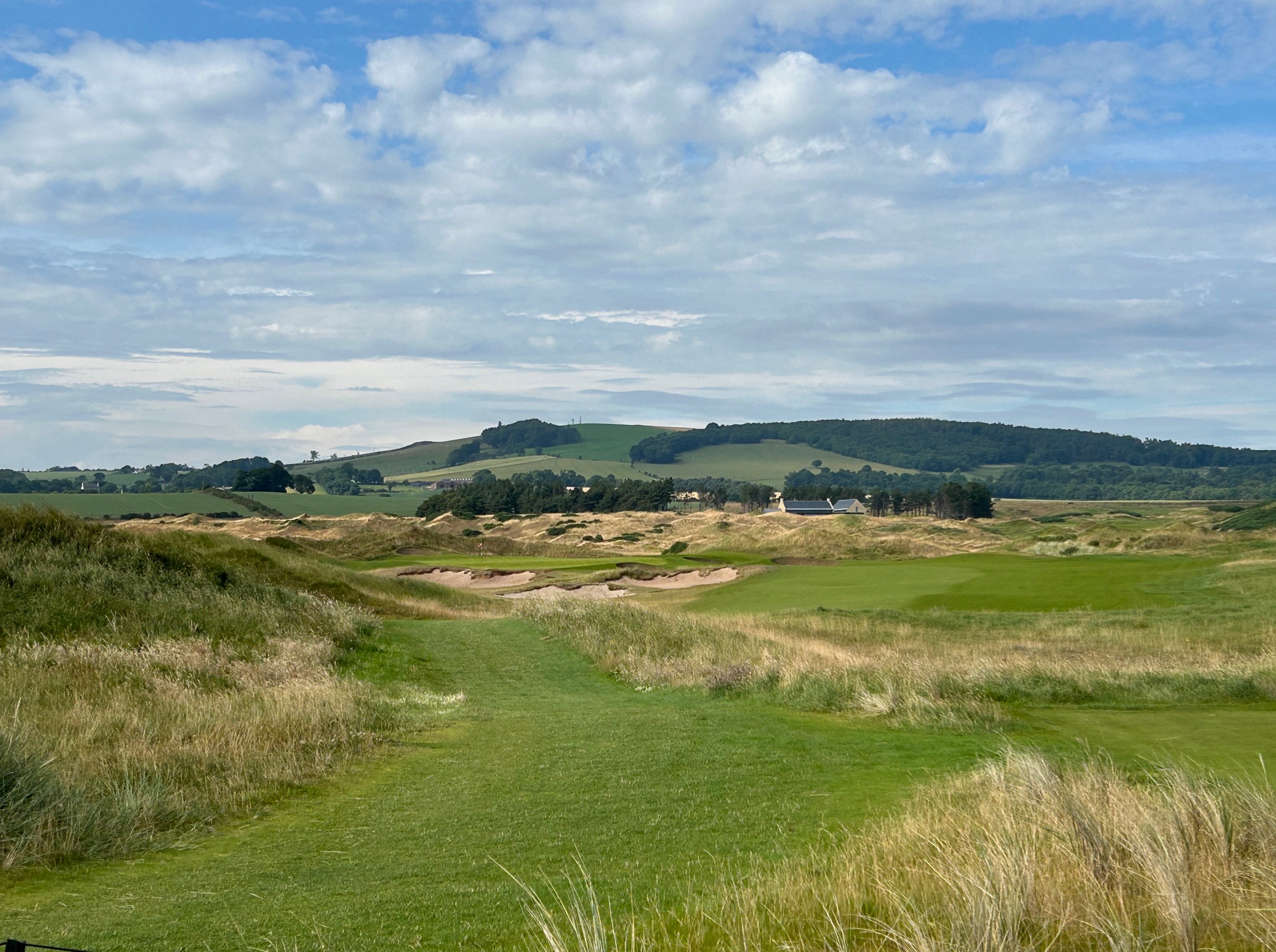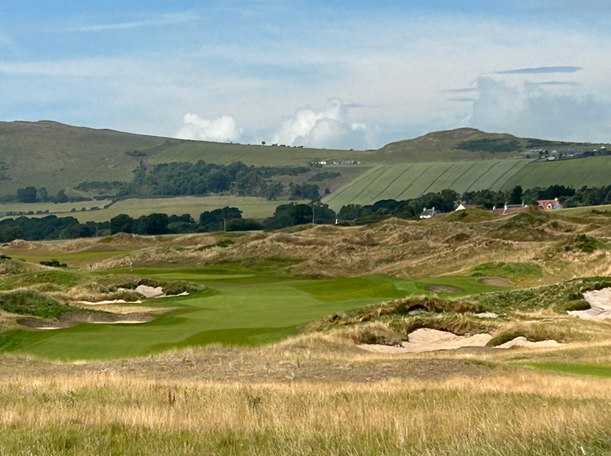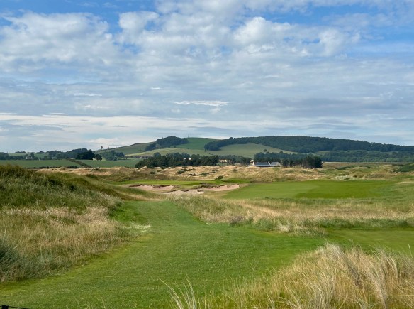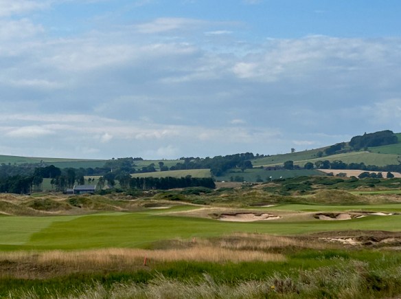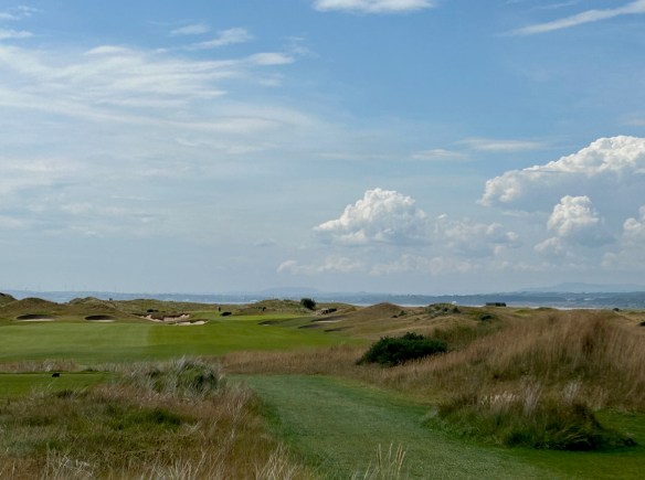This nine ends with another panoramic view of the Firth on the #4 handicap hole on the card, so it is no pushover. After fitting the tee ball into a driving area narrowed by a pair of deep fairway bunkers on the right you are faced with an uphill approach into a green naked of any bunkers with a deep heel print in the back section.