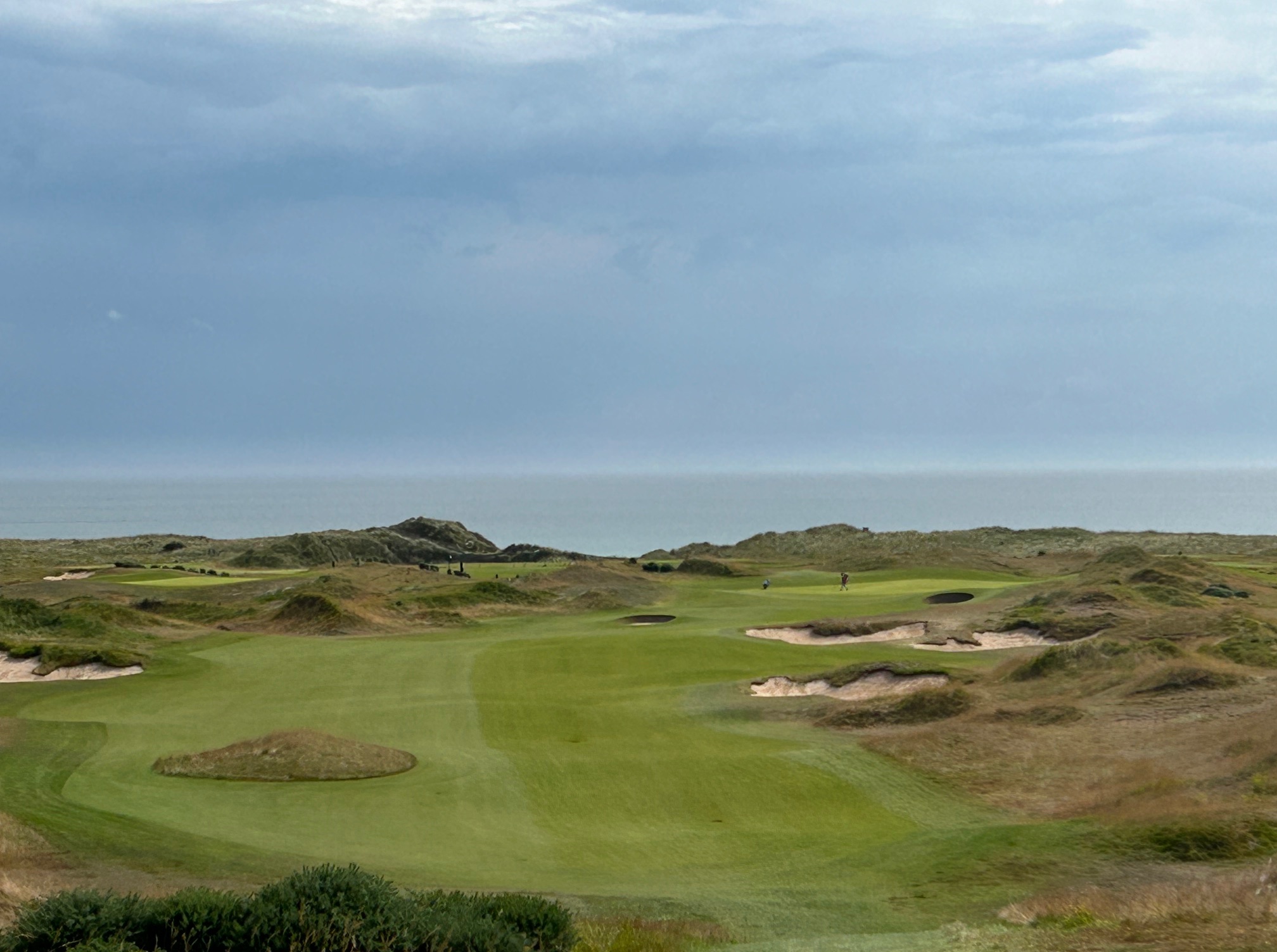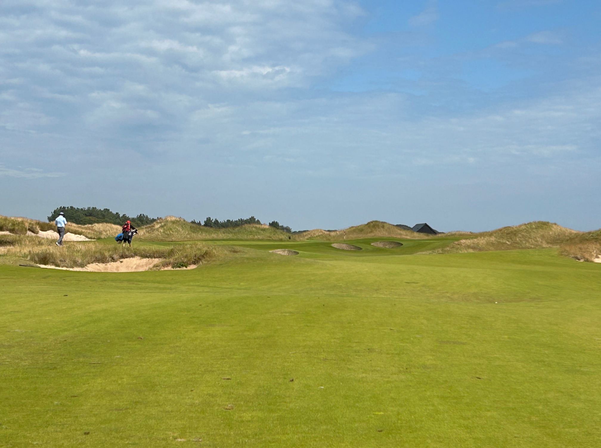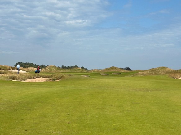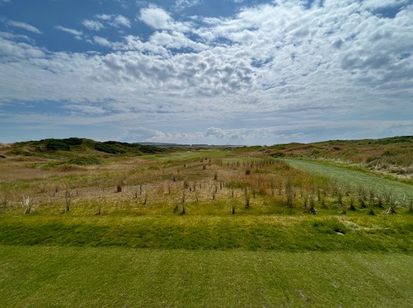 The two three-pars on the outward half are diametrically opposed in both length and topography. The sixth is a medium length uphill right-to-left bias over a wasteland of scrub and sand into a green that is protected by deep revetted face bunkers. The eighth, which tumbles down toward the sea, is just a wee pitch on the shortest hole on the course, but the 40-yard long diagonally set green has three distinct tiers which makes it an absolute lawn dart challenge into the day’s pin to avoid a dreaded three-putt opportunity.