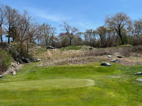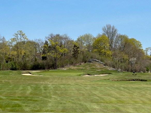 This now brings you to the strangest sequence of two Par 3 holes you have ever seen. From the doorstep of the green supervisor’s home you are staring up a billy goat hill to a green complex perched on a ridge adjacent to the clubhouse. It is an equestrian leap over an array of bunkers into a green dramatically sloped toward you which requires two to three clubs extra depending if the wind adds insult to injury of the severe elevation change from tee to green.