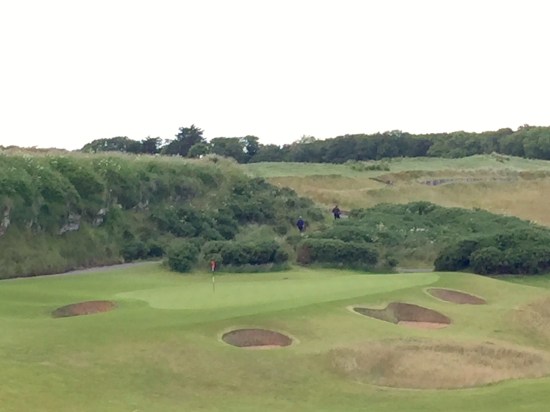 The 14th green that you could not see feeds off the bottom of the hill and sits between low mounds on the right and the beach on the left. That is Fidra Rock just beyond the aiming pole.