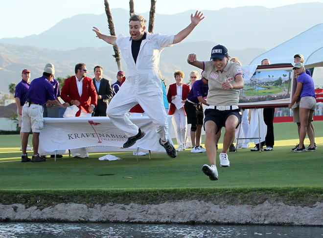 RANCHO MIRAGE, CA – APRIL 01: Sun Young Yoo of Korea and caddie John Limanti take the traditional leap into Poppy’s Pond by the 18th green after Yoo won in a playoff during the final round of the Kraft Nabisco Championship at Mission Hills Country Club on April 1, 2012 in Rancho Mirage, California. (Photo by Stephen Dunn/Getty Images)